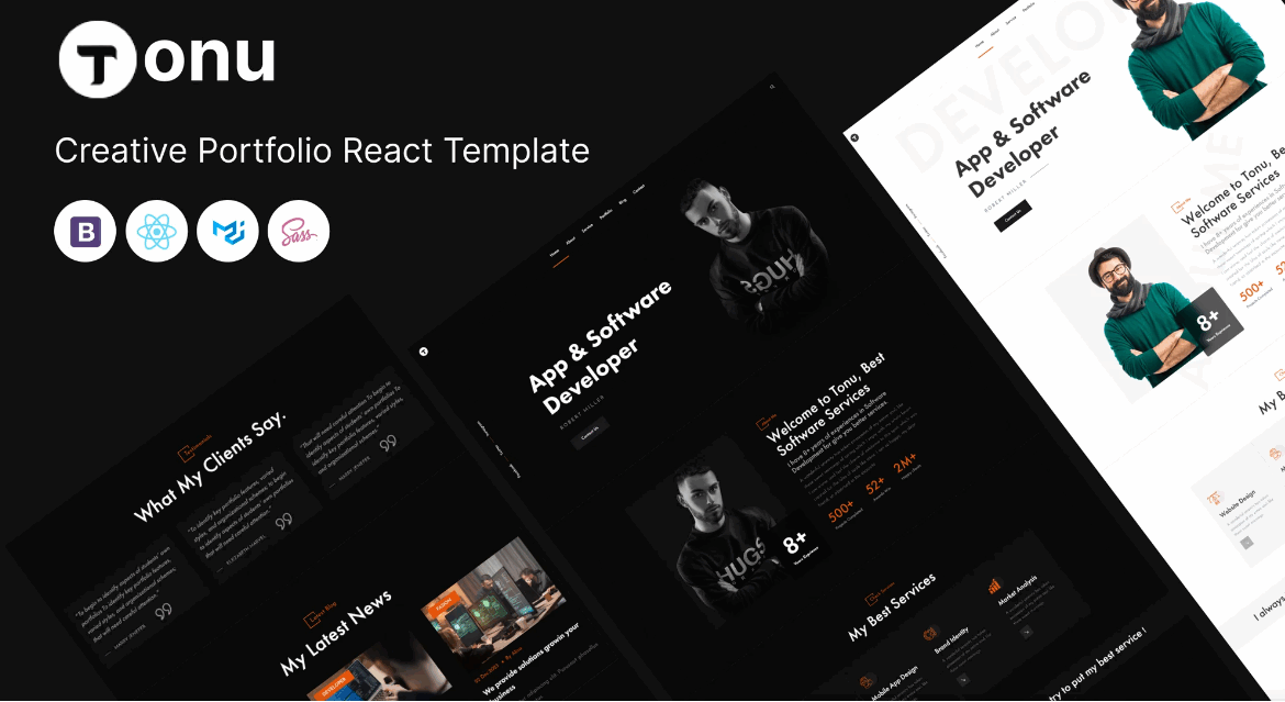 Tonu es la mejor plantilla React para portafolios personales, diseñada para crear un sitio web profesional, atractivo y funcional. Su diseño incluye páginas personalizadas como portafolio, servicios, proyectos, equipo y blog, permitiéndote mostrar tu trabajo de manera impactante. Gracias a sus archivos React de alta calidad, bien organizados y fáciles de personalizar, esta plantilla garantiza una experiencia sin complicaciones para desarrolladores y diseñadores. Además, Tonu es totalmente responsivo, asegurando un aspecto impecable en dispositivos móviles, tabletas y ordenadores.